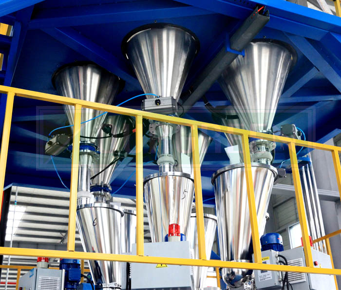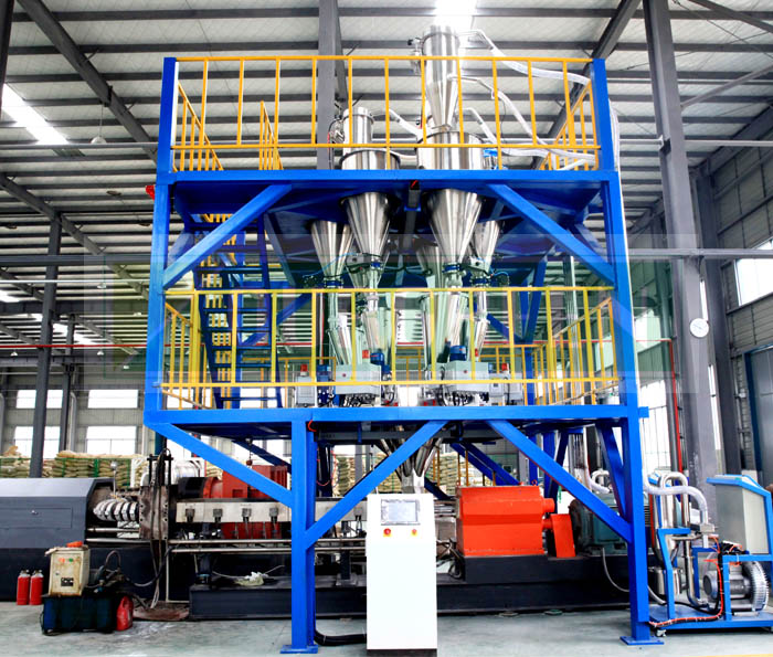 公司的自動上料系統(tǒng)采用特制的攪拌上料系統(tǒng),以確保各種原料混合的均勻。自動化控制保證系統(tǒng)運(yùn)行穩(wěn)定,按照生產(chǎn)配方將各組分別加入到料倉中,經(jīng)真空上料機(jī)后充分?jǐn)嚢?,后將攪拌均勻的物料加入到擠出機(jī)的料斗中。該產(chǎn)品由公司優(yōu)化設(shè)計(jì),使其能夠適應(yīng)各種型號的擠出機(jī)組。
