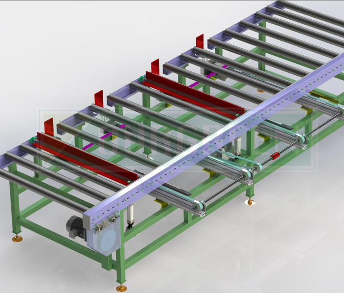 南京歐格設(shè)計制造的機械推手將板材推入碼垛堆疊,堆疊成包裝要求高度,輸出打包。